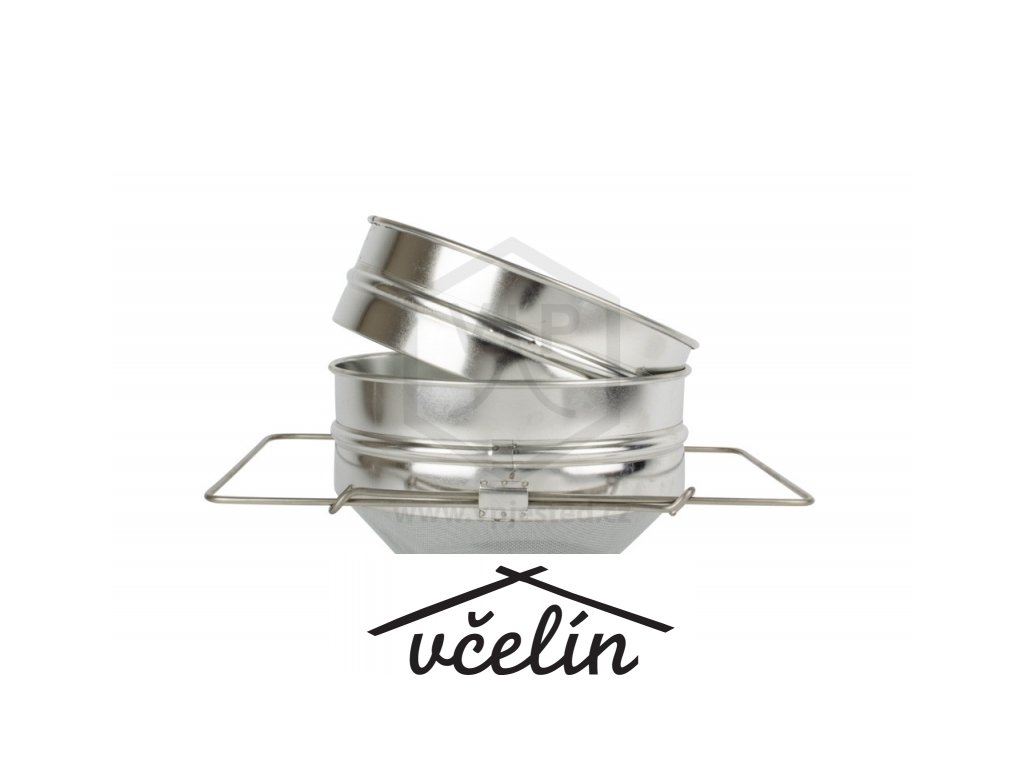 › Včelařské potřeby › Chovatelské potřeby › Včelařství › Práce s včelím medem › Síta a cedníky na včelí med › Cedník na med dvojitý vypouklý s úchyty pocín